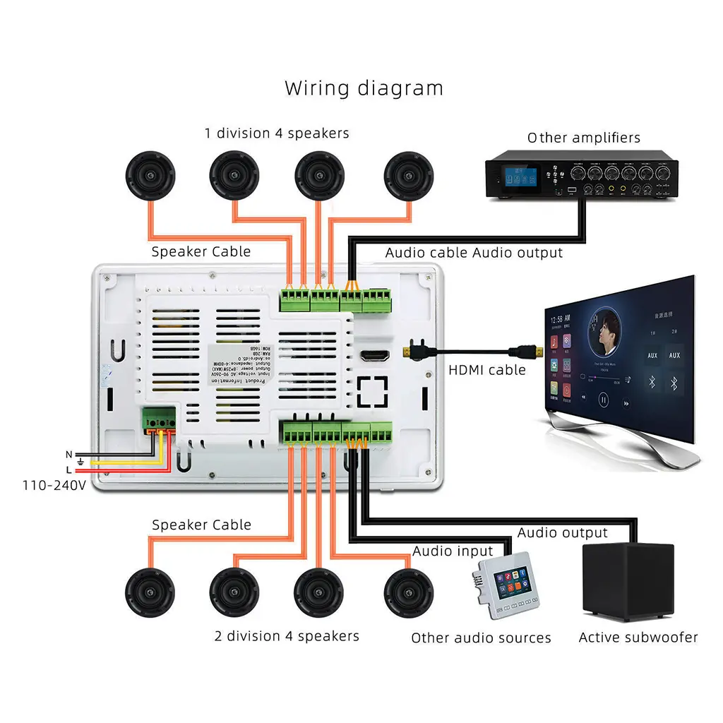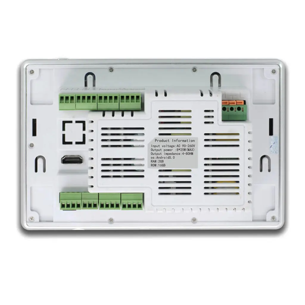 تاچ پنل صوتی دیواری اندروید دارای توان خروجی 8 کانال 25 وات است که از چیپ‌های یاماها بهره می‌برد. این ویژگی امکان اتصال 8 اسپیکر را فراهم می‌کند و صدایی با وضوح و کیفیت بالا را در فضا پخش می‌کند. ترکیب این مشخصات با اسپیکرهای مناسب، صدای قوی و فراگیر در محیط ایجاد می‌کند.