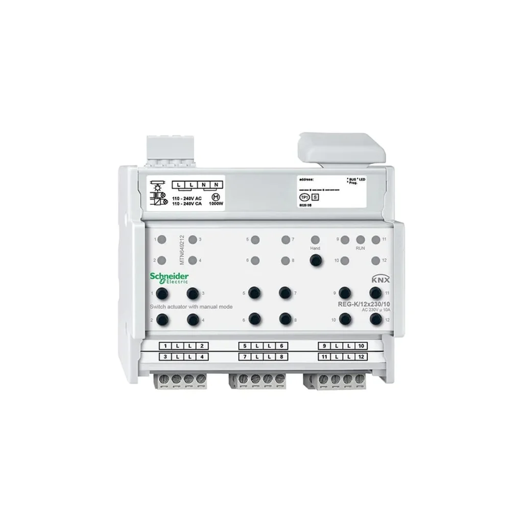 رله 12 کانال 10 آمپر اشنایدر کد MTN649212 با نام فنی REG-K/12×230/10 یک اکچویتور حرفهای مبتنی بر پروتکل KNX است که برای پروژههای هوشمندسازی پیشرفته طراحی شده است. این ماژول ریلی با بهرهگیری از 12 کنتاکت مجزا و شناور (Floating Contacts) امکان سوئیچینگ همزمان دوازده مدار مستقل را فراهم میکند و انتخابی ایدهآل برای کنترل روشنایی، پریزهای فرمانپذیر، تجهیزات موتوری سبک و بارهای مقاومتی تا ۱۰ آمپر در هر کانال محسوب میشود. معماری داخلی دستگاه بهگونهای توسعه یافته که ضمن حفظ ایزولاسیون الکتریکی هر خروجی، پایداری عملکرد در سیکلهای سوئیچینگ پرتکرار را تضمین کند.