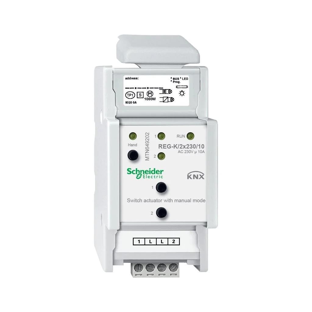 رله سوئیچ دو کاناله Schneider Electric مدل MTN649202 یک عملگر حرفهای KNX از سری REG-K است که برای کنترل مطمئن بارهای 230 ولت AC در پروژههای هوشمندسازی ساختمان طراحی شده است.